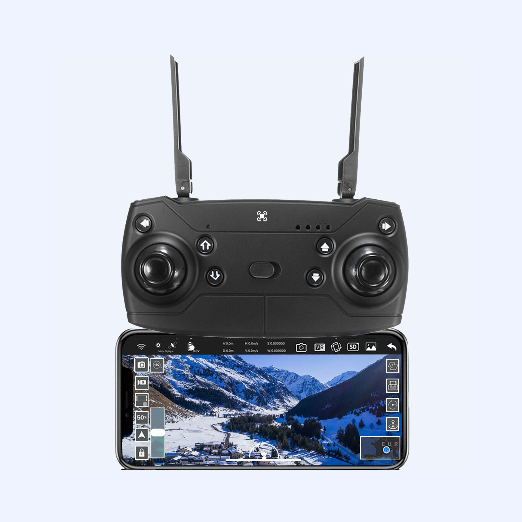 Toma el control de tu dron desde tu smartphone con nuestra aplicación disponible en la App Store y Play Store.